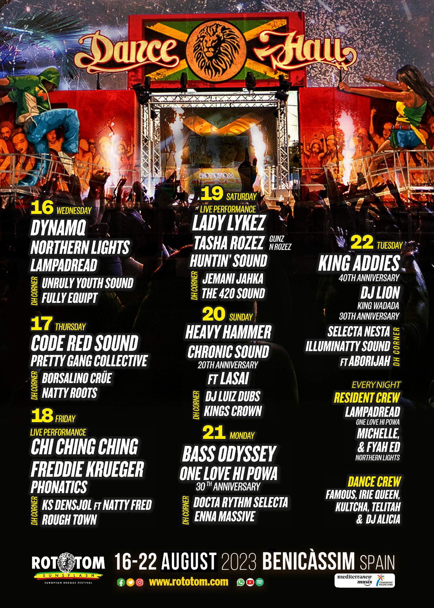 La mejor música se adereza con espectáculos a cargo de los bailarines internacionales más destacados del género para dar vida a un escenario que, año tras año, cuenta con más incondicionales. Un pedacito de Jamaica en pleno recinto de conciertos.